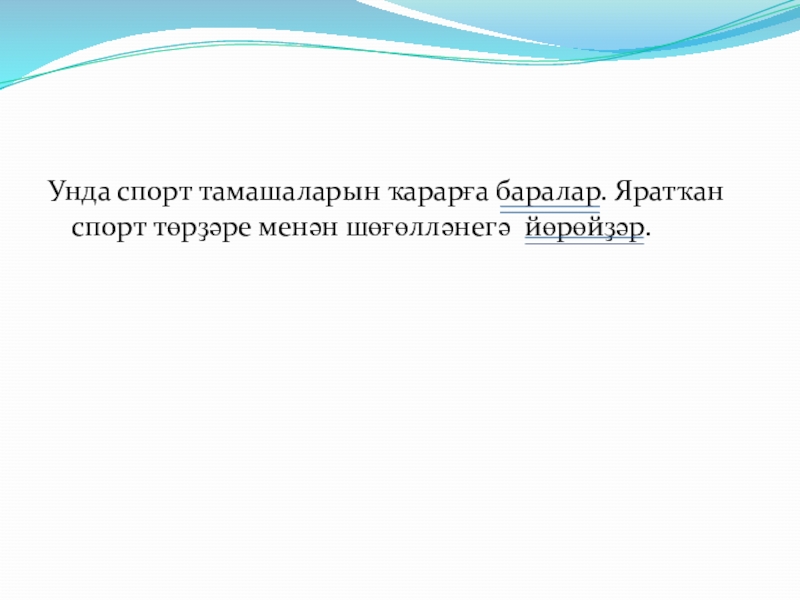 Слайд 9Унда спорт тамашаларын ҡарарға баралар. Яратҡан спорт төрҙәре менән шөғөлләнегә йөрөйҙәр.
