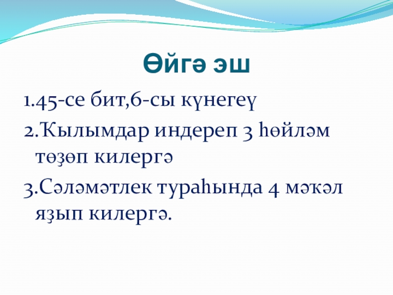 Өйгә эш 1.45-се бит,6-сы күнегеү2.Ҡылымдар индереп 3 һөйләм төҙөп килергә3.Сәләмәтлек тураһында 4 мәҡәл яҙып килергә.