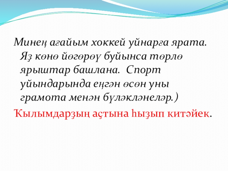 Минең ағайым хоккей уйнарға ярата. Яҙ көнө йөгөрөү буйынса төрлө ярыштар башлана. Спорт уйындарында еңгән өсөн уны