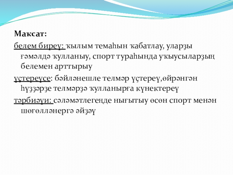 Маҡсат:белем биреү: ҡылым темаһын ҡабатлау, уларҙы ғәмәлдә ҡулланыу, спорт тураһында уҡыусыларҙың белемен арттырыуүҫтереүсе: бәйләнешле телмәр үҫтереү,өйрәнгән һүҙҙәрҙе