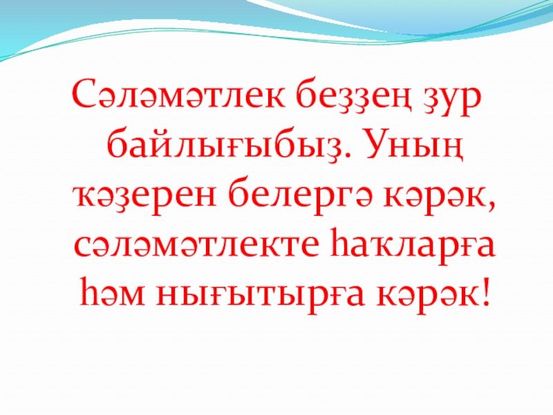 Слайд 23Сәләмәтлек беҙҙең ҙур байлығыбыҙ. Уның ҡәҙерен белергә кәрәк, сәләмәтлекте һаҡларға һәм