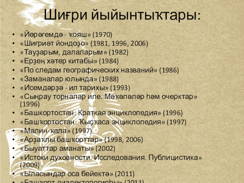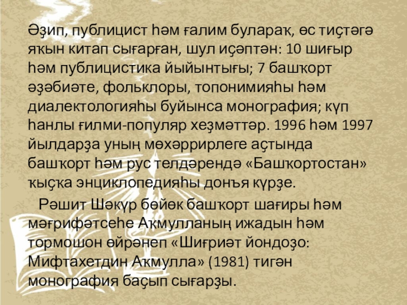 Слайд 6Әҙип, публицист һәм ғалим булараҡ, өс тиҫтәгә яҡын китап сығарған, шул