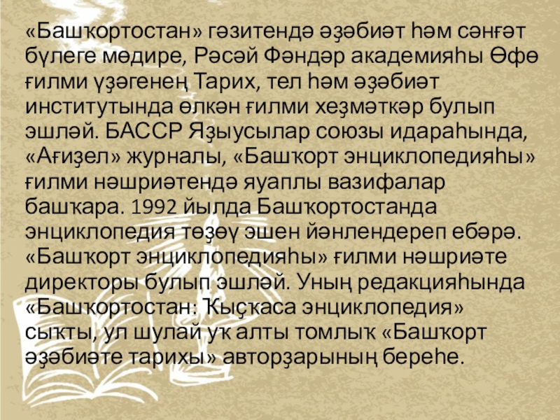 Слайд 4«Башҡортостан» гәзитендә әҙәбиәт һәм сәнғәт бүлеге мөдире, Рәсәй Фәндәр академияһы Өфө