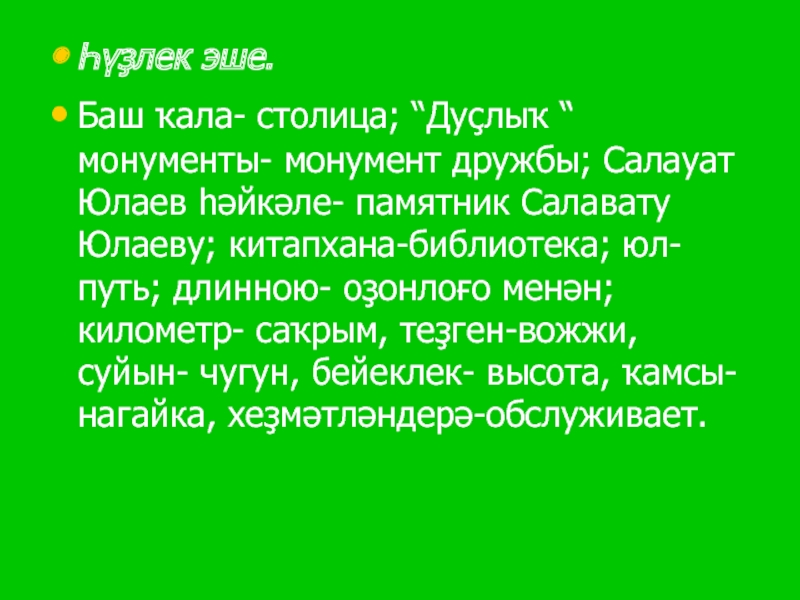 Баш ҡала- столица; “Дуҫлыҡ “ монументы- монумент дружбы; Салауат