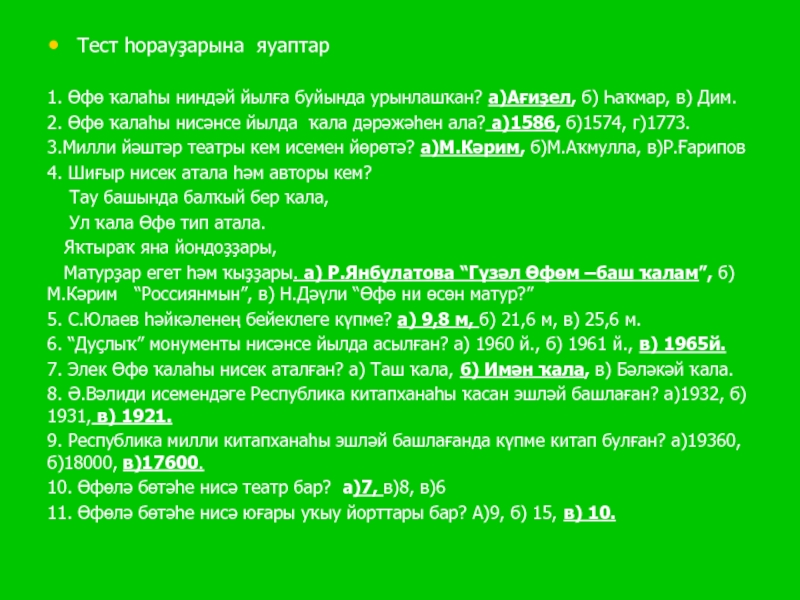 9. Республика милли китапханаһы эшләй башлағанда күпме китап булған? а)19360, б)18000, в)17600.