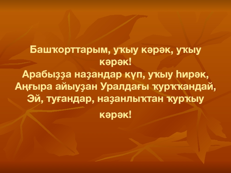 Слайд 2Башҡорттарым, уҡыу кәрәк, уҡыу кәрәк! Арабыҙҙа наҙандар күп, уҡыу һирәк, Аңғыра айыуҙан Уралдағы