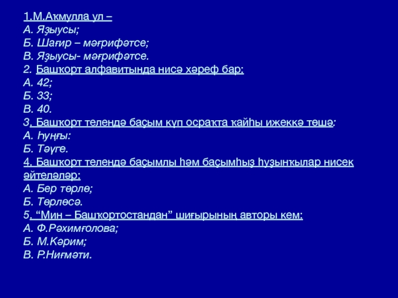 1.М.Аҡмулла ул – А. Яҙыусы; Б. Шағир – мәғрифәтсе; В. Яҙыусы- мәғрифәтсе. 2. Башҡорт алфавитында нисә хәреф