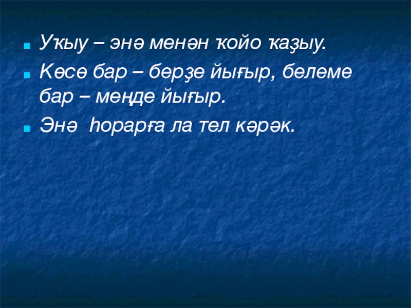 Уҡ_у – энә мен_н ҡойо ҡаҙ_у.К_сө бар – б_рҙе йығ_р, белеме бар – меңде йығ_р.Эн_ һор_рға ла