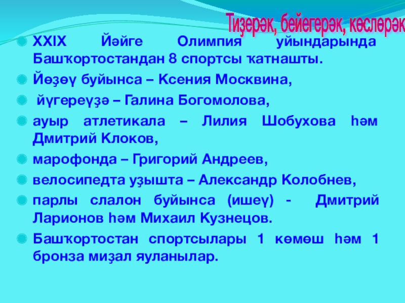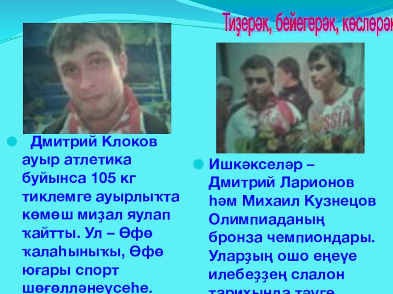Ишкәкселәр – Дмитрий Ларионов һәм Михаил Кузнецов Олимпиаданың бронза чемпиондары. Уларҙың ошо еңеүе илебеҙҙең слалон тарихында тәүге миҙал.