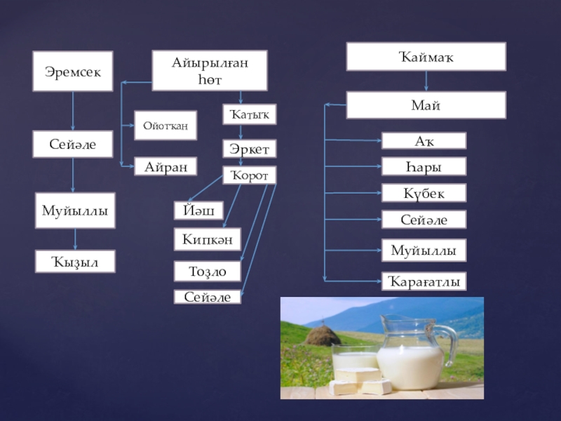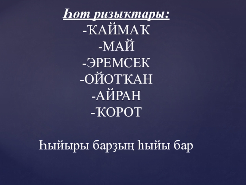 Слайд 3Һөт ризыҡтары: -ҠАЙМАҠ -МАЙ -ЭРЕМСЕК -ОЙОТҠАН -АЙРАН -ҠОРОТ Һыйыры барҙың һыйы бар