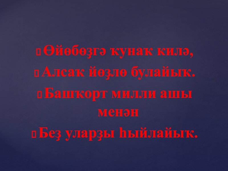 Өйөбөҙгә ҡунаҡ килә,Алсаҡ йөҙлө булайыҡ.Башҡорт милли ашы менәнБеҙ уларҙы һыйлайыҡ.