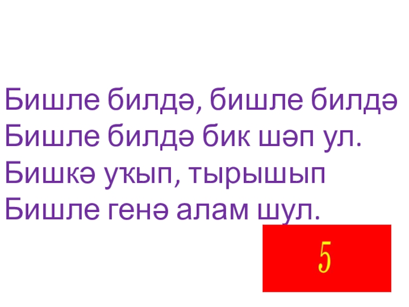 Слайд 18Бишле билдә, бишле билдә Бишле билдә бик шәп ул. Бишкә уҡып, тырышып Бишле генә