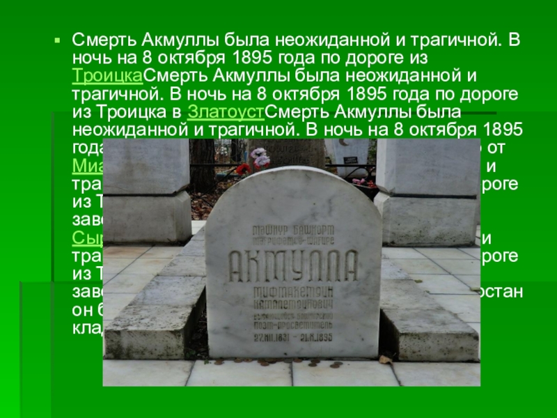1895 года по дороге из ТроицкаСмерть Акмуллы была неожиданной и трагичной. В ночь на 8 октября 1895 года по дороге из Троицка в ЗлатоустСмерть Акмуллы была неожиданной и трагичной. В ночь на 8 октября 1895 года по дороге из Троицка в Златоуст недалеко от МиасскогоСмерть Акмуллы была неожиданной и трагичной. В ночь на 8 октября 1895 года по дороге из Троицка в Златоуст недалеко от Миасского завода вблизи железнодорожной станции СыростанСмерть Акмуллы была неожиданной и трагичной. В ночь на 8 октября 1895 года по дороге из Троицка в Златоуст недалеко от Миасского завода вблизи железнодорожной станции Сыростан он был убит. Похоронен на мусульманском кладбище Миасса.