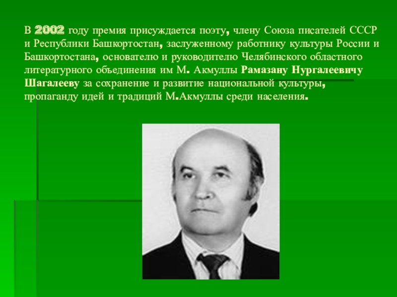 Слайд 31В 2002 году премия присуждается поэту, члену Союза писателей СССР и Республики Башкортостан,
