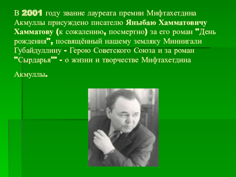 Слайд 30В 2001 году звание лауреата премии Мифтахетдина Акмуллы присуждено писателю Яныбаю