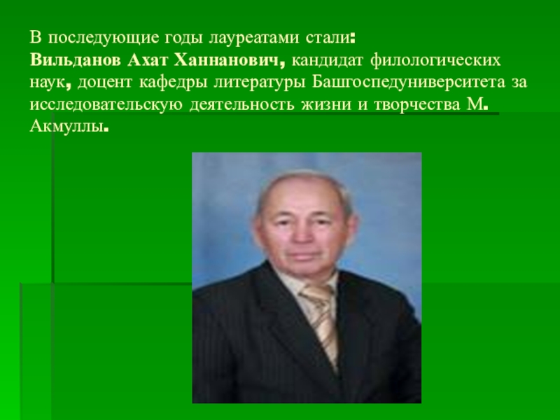 Слайд 22Первым лауреатом премии М.Акмуллы заслуженно стал Шакуров Рашит Закирович, поэт, доктор