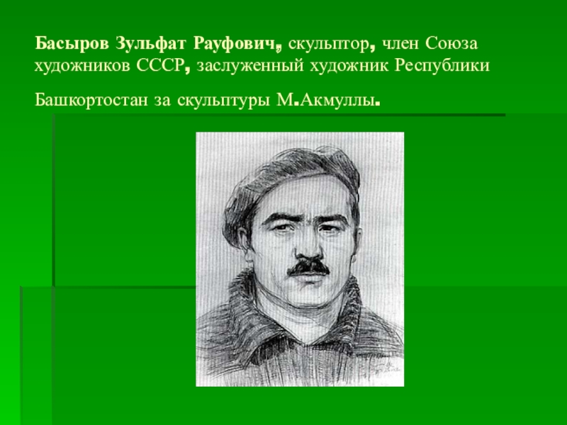 Слайд 25Басыров Зульфат Рауфович, скульптор, член Союза художников СССР, заслуженный художник Республики