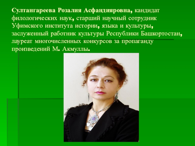 Слайд 24Султангареева Розалия Асфандияровна, кандидат филологических наук, старший научный сотрудник Уфимского института
