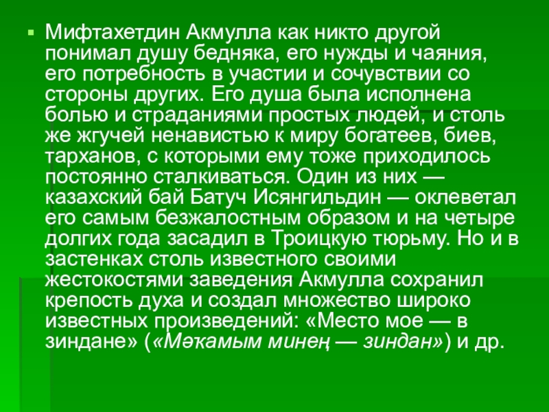 чаяния, его потребность в участии и сочувствии со стороны других. Его душа была исполнена болью и страданиями простых людей, и столь же жгучей ненавистью к миру богатеев, биев, тарханов, с которыми ему тоже приходилось постоянно сталкиваться. Один из них — казахский бай Батуч Исянгильдин — оклеветал его самым безжалостным образом и на четыре долгих года засадил в Троицкую тюрьму. Но и в застенках столь известного своими жестокостями заведения Акмулла сохранил крепость духа и создал множество широко известных произведений: «Место мое — в зиндане» («Мәҡамым минең — зиндан») и др.
