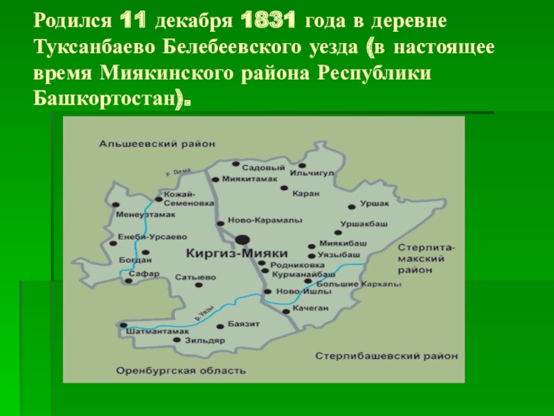 Слайд 5Родился 11 декабря 1831 года в деревне Туксанбаево Белебеевского уезда (в