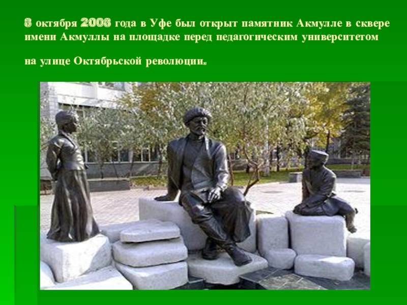 Слайд 348 октября 2008 года в Уфе был открыт памятник Акмулле в