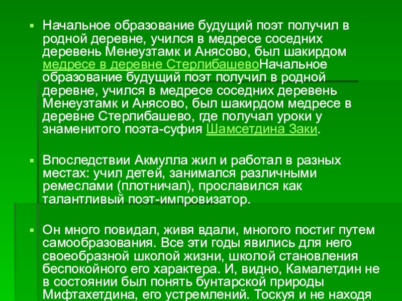 Слайд 8Начальное образование будущий поэт получил в родной деревне, учился в медресе