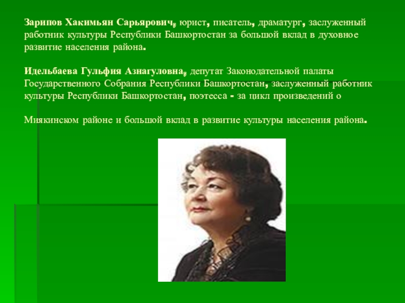 Слайд 29Зарипов Хакимьян Сарьярович, юрист, писатель, драматург, заслуженный работник культуры Республики Башкортостан