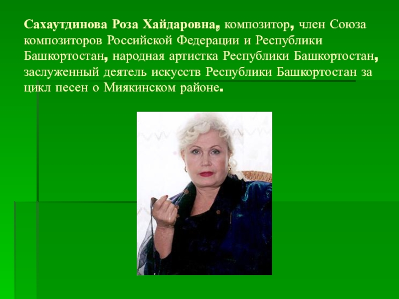 Слайд 26Сахаутдинова Роза Хайдаровна, композитор, член Союза композиторов Российской Федерации и Республики