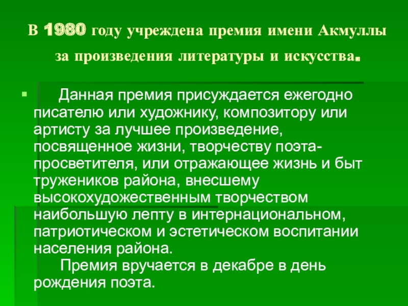 Слайд 21В 1980 году учреждена премия имени Акмуллы за произведения литературы и
