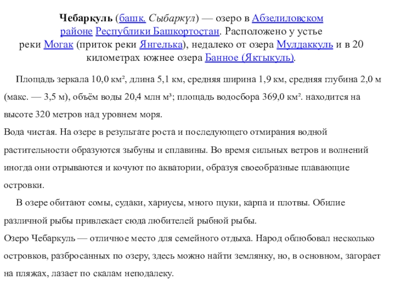 Озеро Чебаркуль — отличное место для семейного отдыха. Народ облюбовал несколько островков, разбросанных по озеру, здесь можно найти землянку, но, в основном, загорает на пляжах, лазает по скалам неподалеку.