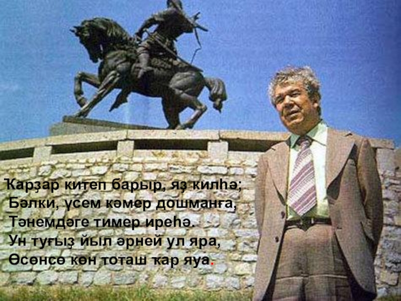 Ҡарҙар китеп барыр, яҙ килһә; Бәлки, үсем кәмер дошманға, Тәнемдәге тимер иреһә. Ун туғыҙ йыл әрней ул