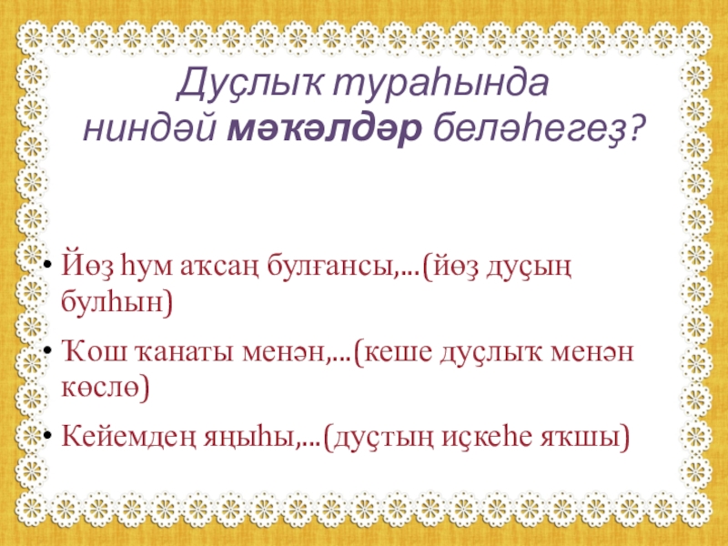 Слайд 5Дуҫлыҡ тураһында ниндәй мәҡәлдәр беләһегеҙ?
