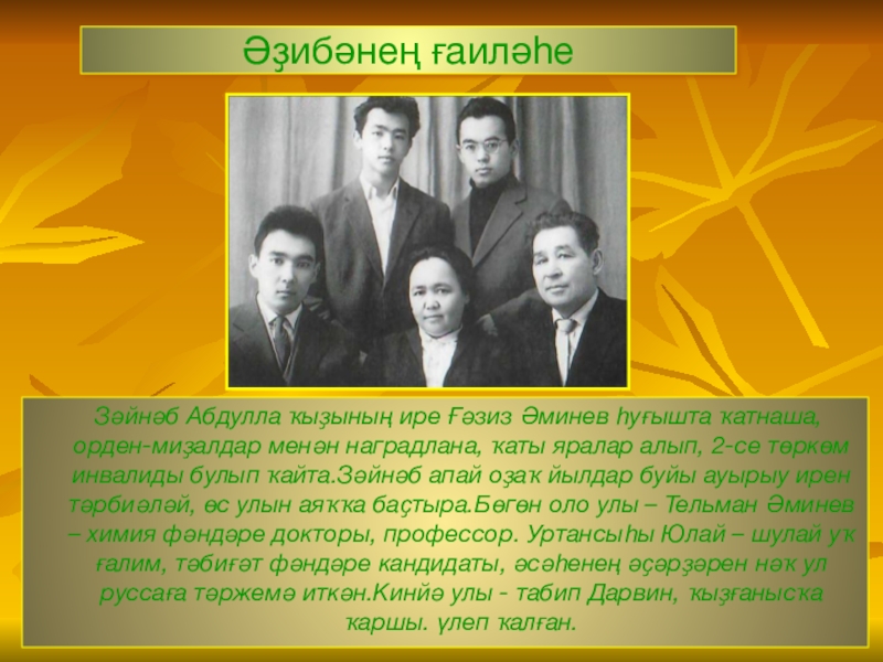орден-миҙалдар менән наградлана, ҡаты яралар алып, 2-се төркөм инвалиды булып ҡайта.Зәйнәб апай оҙаҡ йылдар буйы ауырыу ирен тәрбиәләй, өс улын аяҡҡа баҫтыра.Бөгөн оло улы – Тельман Әминев – химия фәндәре докторы, профессор. Уртансыһы Юлай – шулай уҡ ғалим, тәбиғәт фәндәре кандидаты, әсәһенең әҫәрҙәрен нәҡ ул руссаға тәржемә иткән.Кинйә улы - табип Дарвин, ҡыҙғанысҡа ҡаршы. үлеп ҡалған.