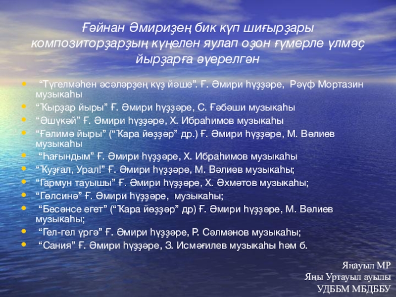 “Сания” Ғ. Әмири һүҙҙәре, З. Исмәғилев музыкаһы һәм б.