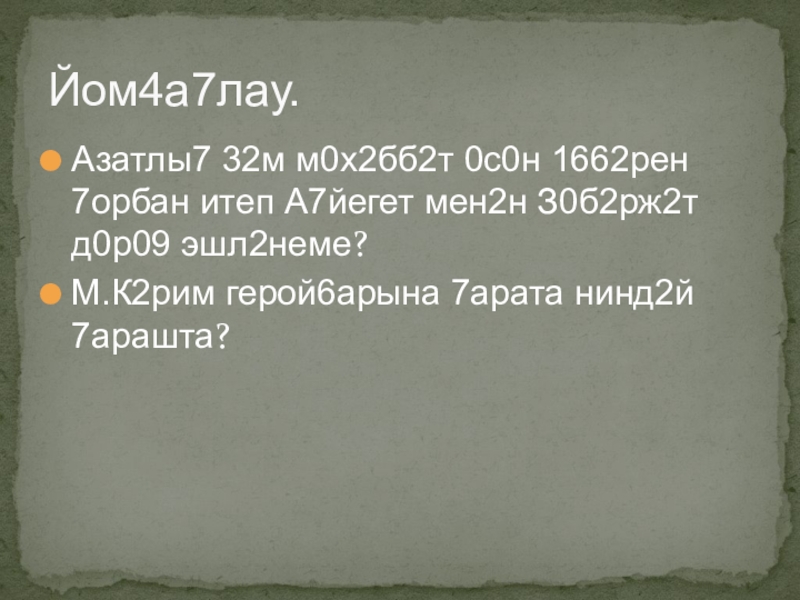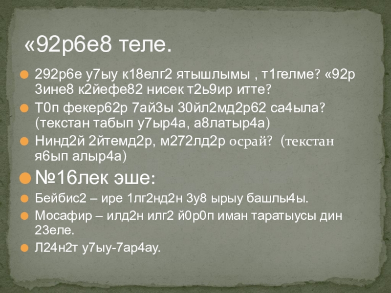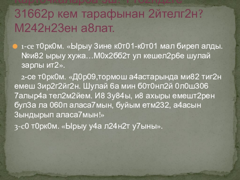 Карточкалар6а эш. Т1б2нд2ге 31662р кем тарафынан 2йтелг2н? М242н23ен а8лат.