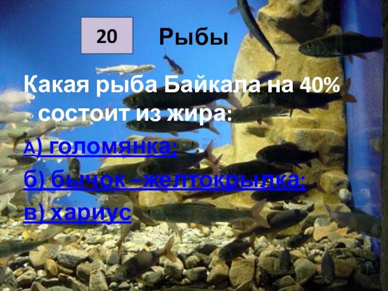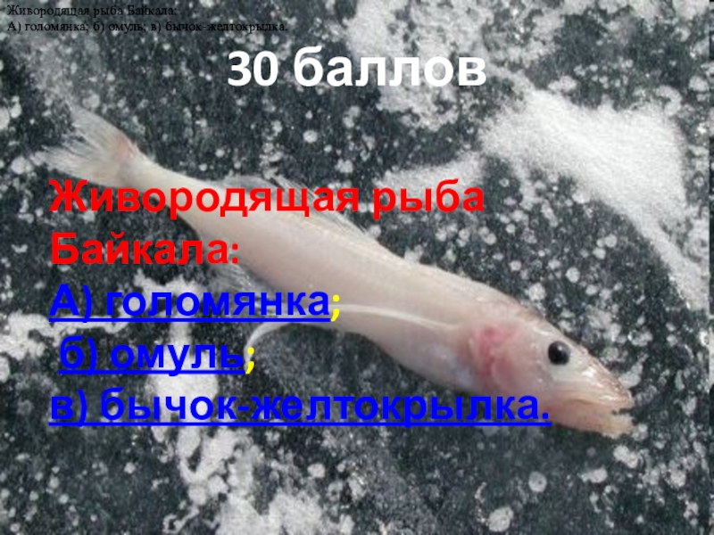 А) голомянка; б) омуль; в) бычок-желтокрылка.