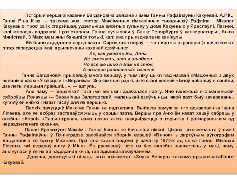 Багдановіч пазнаёміўся па перапісцы. У 1916 годзе ён заканчваў Яраслаўскі юрыдычны ліцэй, яна — актыўна ўдзельнічала ў літаратурна-грамадскім і асветніцкім руху ў Мінску. Ініцыятыва пісьмовага звароту да Багдановіча сыходзіла менавіта ад яе. І ён адгукнуўся.