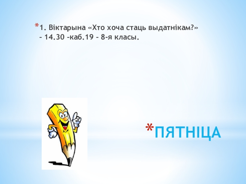 1. Віктарына «Хто хоча стаць выдатнікам?» – 14.30 –каб.19 – 8-я