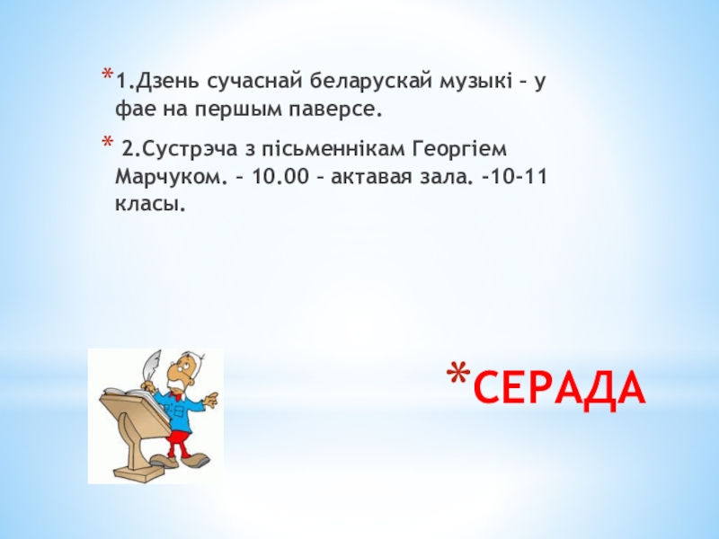 з пісьменнікам Георгіем Марчуком. – 10.00 – актавая зала. -10-11 класы.