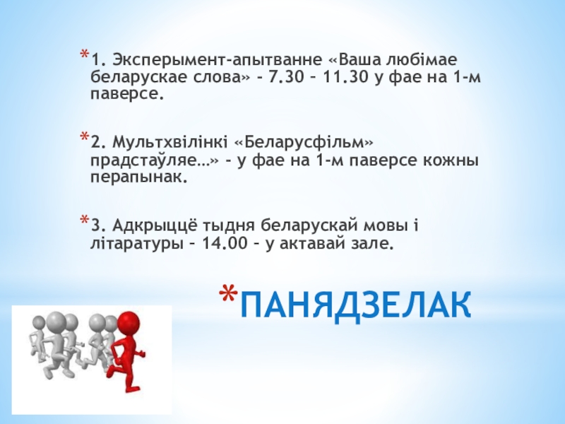 1. Эксперымент-апытванне «Ваша любімае беларускае слова» - 7.30 – 11.30 у