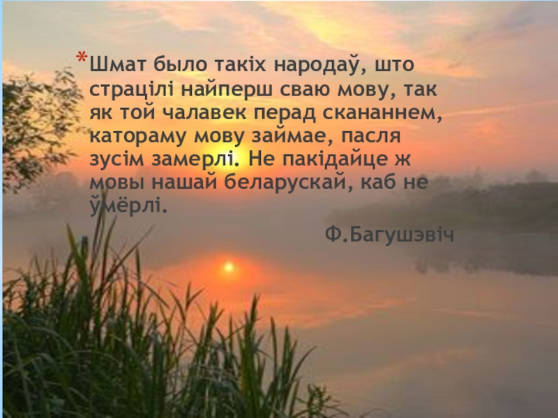 Слайд 8Там, дзе не шануюць роднай мовы, мялеюць рэкі, нішчацца дубровы, народ