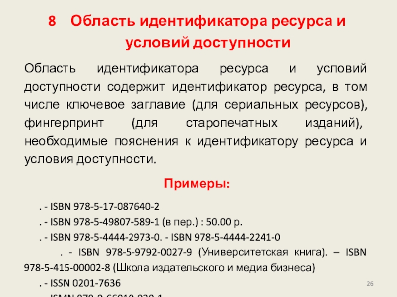 содержит идентификатор ресурса, в том числе ключевое заглавие (для сериальных ресурсов), фингерпринт (для старопечатных изданий), необходимые пояснения к идентификатору ресурса и условия доступности.