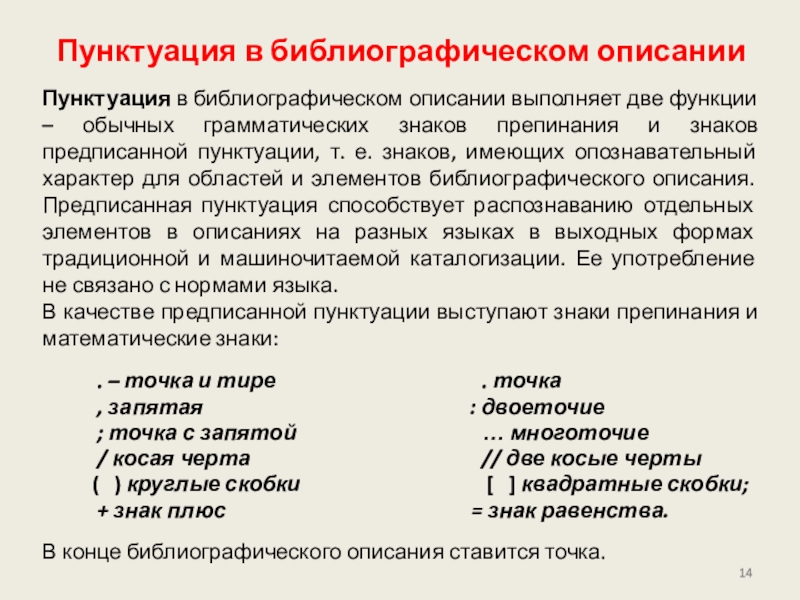 обычных грамматических знаков препинания и знаков предписанной пунктуации, т. е. знаков, имеющих опознавательный характер для областей и элементов библиографического описания. Предписанная пунктуация способствует распознаванию отдельных элементов в описаниях на разных языках в выходных формах традиционной и машиночитаемой каталогизации. Ее употребление не связано с нормами языка.