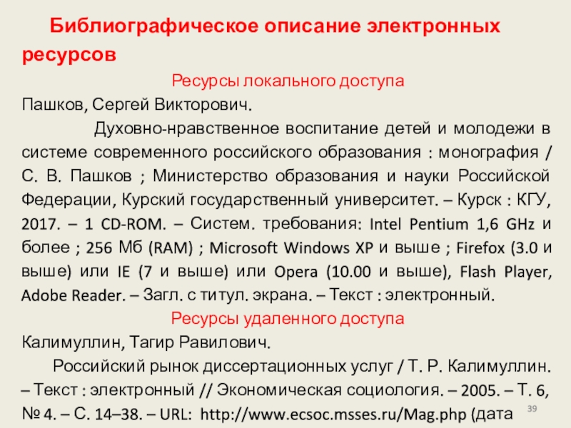Слайд 39Библиографическое описание электронных ресурсов