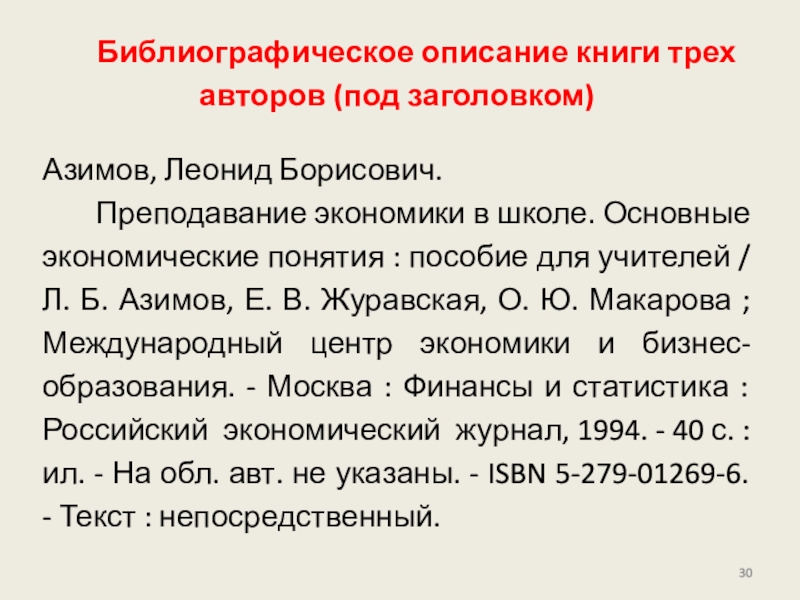 Слайд 30Библиографическое описание книги трех авторов (под заголовком)