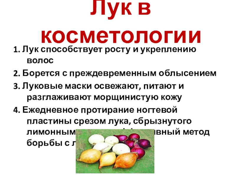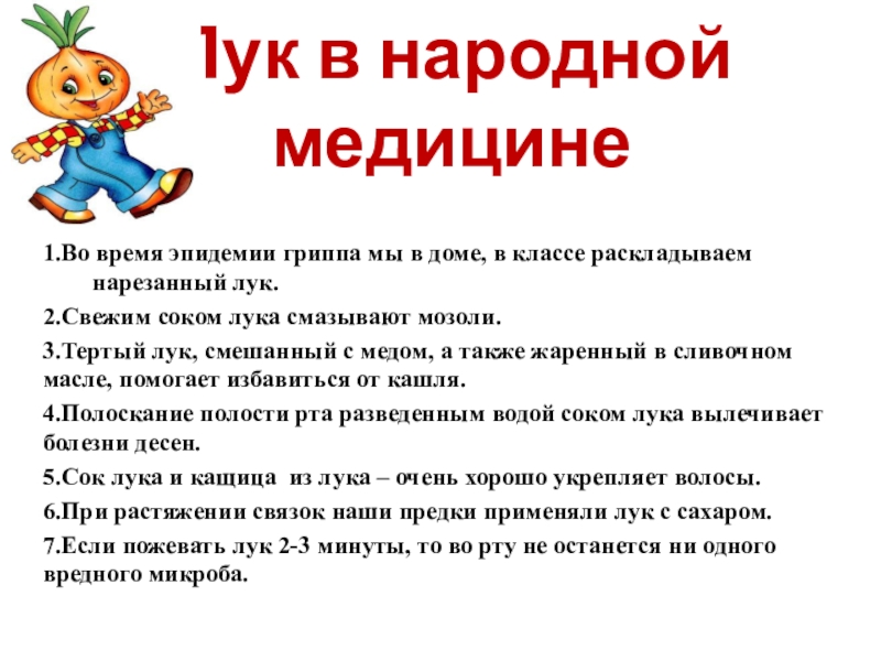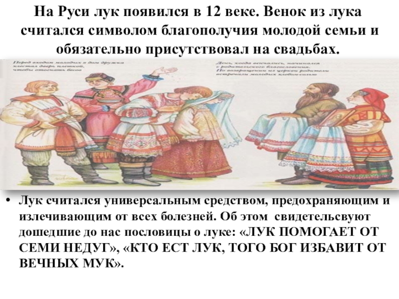 Лук считался универсальным средством, предохраняющим и излечивающим от всех болезней. Об этом свидетельсвуют дошедшие до нас пословицы о луке: «ЛУК ПОМОГАЕТ ОТ СЕМИ НЕДУГ», «КТО ЕСТ ЛУК, ТОГО БОГ ИЗБАВИТ ОТ ВЕЧНЫХ МУК».
