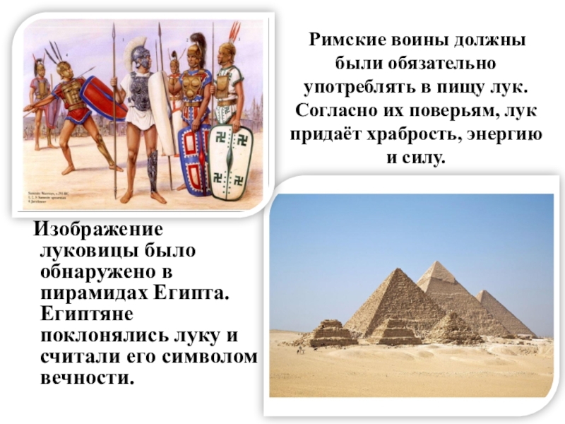 Изображение луковицы было обнаружено в пирамидах Египта. Египтяне поклонялись луку и считали его символом вечности.