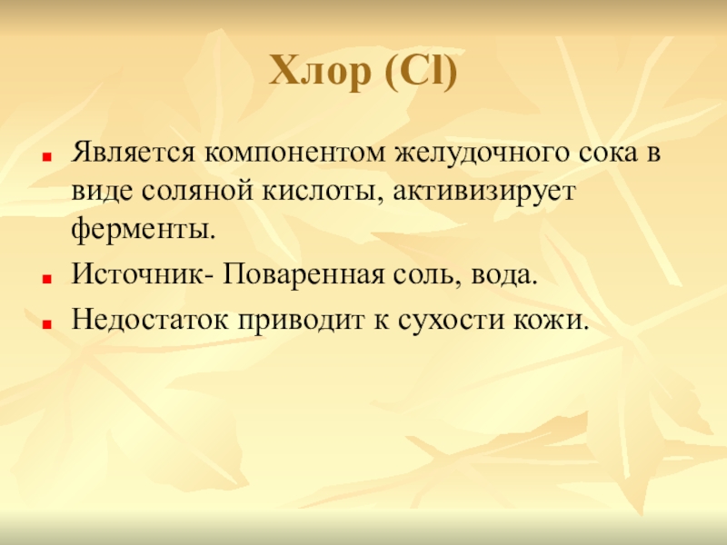 Является компонентом желудочного сока в виде соляной кислоты, активизирует ферменты.
