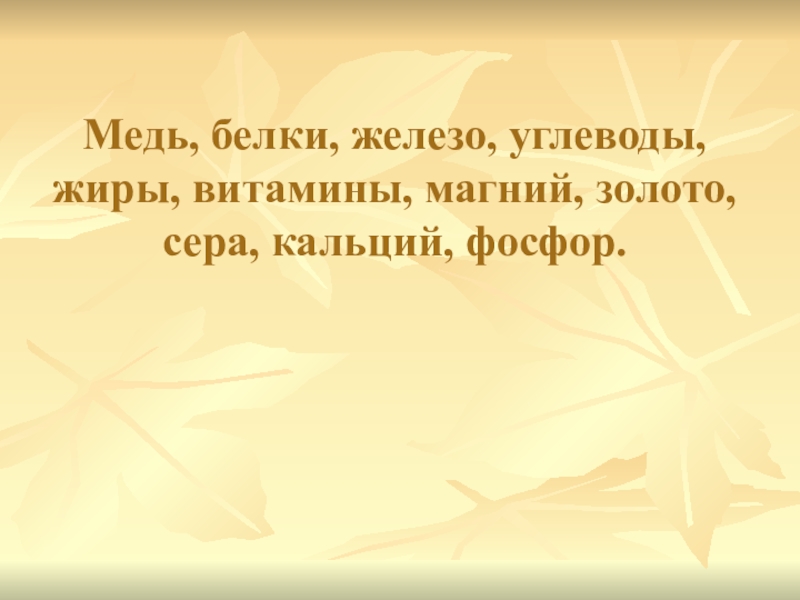 Слайд 1Медь, белки, железо, углеводы, жиры, витамины, магний, золото, сера, кальций, фосфор.