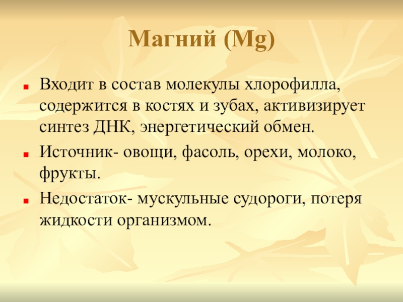 Входит в состав молекулы хлорофилла, содержится в костях и зубах,